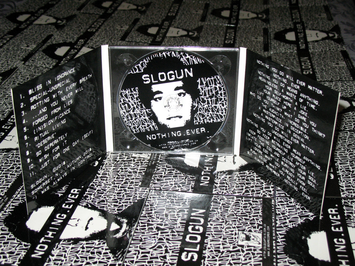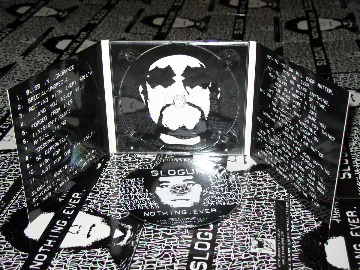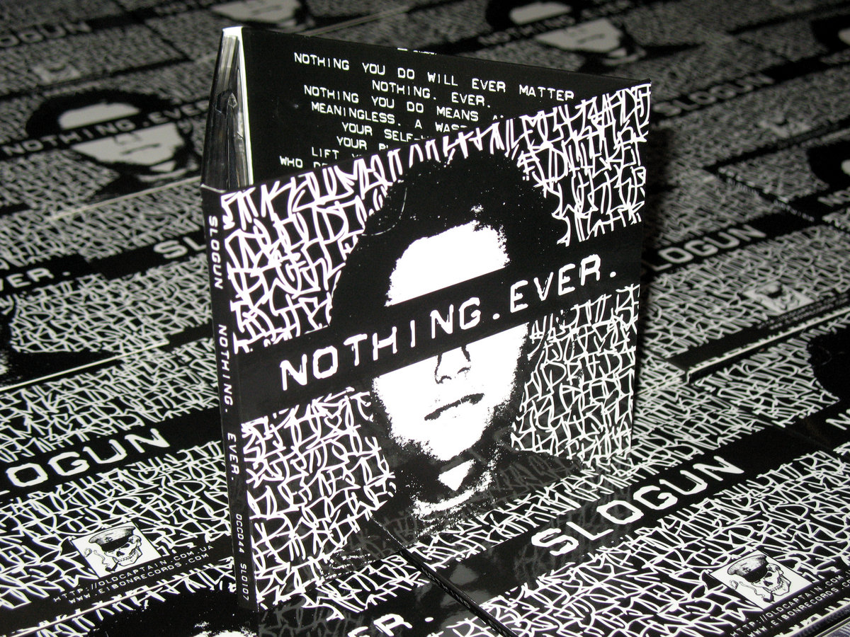 “Nothing you do will ever matter. Nothing. Ever.” The first full-length release by American True Crime Electronics project Slogun, aka John Balistreri, since “I Will Bury You” in 2013, features eleven new tracks, the last of which is the 12-minute piece “Just For One Day” from his side-project “Self”. Continuing his journey inward, “Nothing. Ever.” delves deeper into self-hate, disgust and the absolute exhaustion of escaping the foundation of which his life was built on: failure and all of its expectations and realizations. Tracks 1 through 10 offer up Slogun at its truest, spewing truth about self-actualization, manipulation, denial and justification, while track 11 has “Self” finishing everything off with pure defeat. The end of it all. Featuring Slogun’s own art and handwriting, “Nothing. Ever.” quite possibly closes out a 23-year journey through the depths of one-man’s disgust at himself, at the notion of “civility”, at victimization and of the human animal. Brooklyn, NY. Somerset, NJ. 1996-2019. F.T.W.